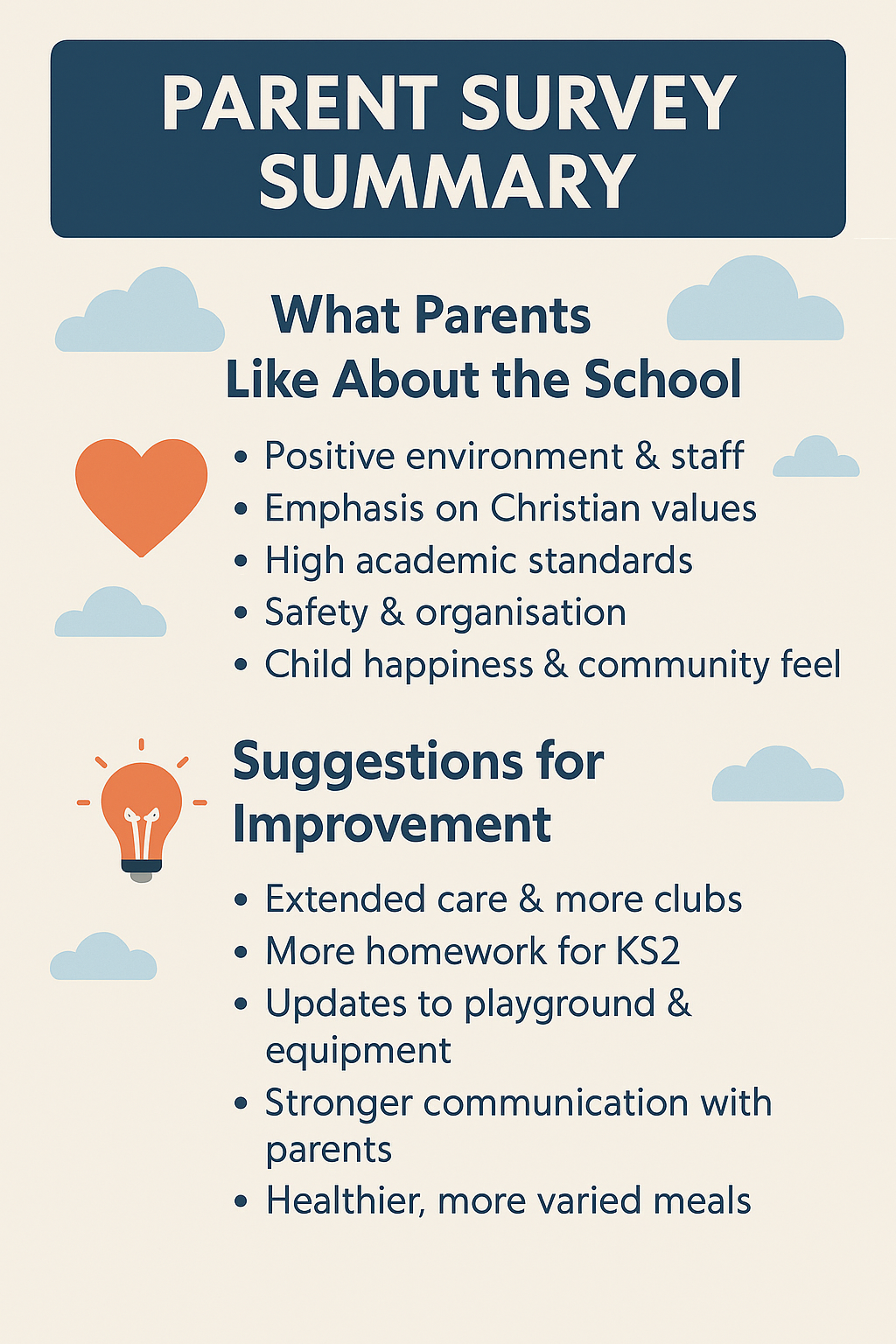 We sent out a survery to our parents in November 2025. Here is the summary of the hugely positive feedback we receieved.